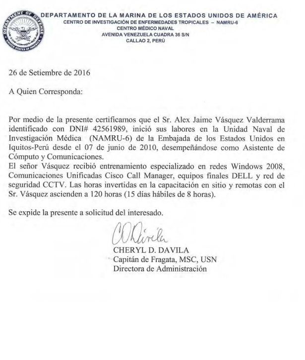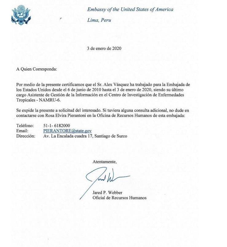 Certificado de Trabajo de 10 años de servicio en la misión, siendo mi último cargo asistente de la gestión de la información.