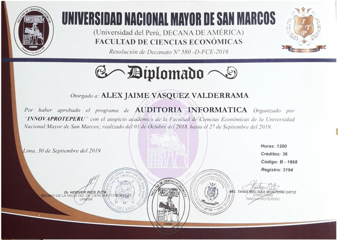 Diplomado en auditoria informática Octubre 2018 al Septiembre 2019, 1200 horas académicas.